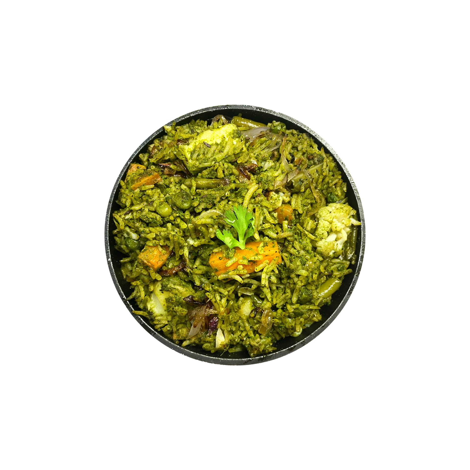 A vibrant green masterpiece, where fragrant basmati rice is infused with a slow-cooked, herbaceous blend of fresh coriander, mint, and green chilies. The layers of spice-kissed vegetables, caramelized onions, and saffron-kissed ghee create a dish that is as striking in color as it is in flavor. Aromatic, mildly spiced, and bursting with fresh, garden-fresh notes, this biryani is a unique take on the traditional Hyderabadi style.