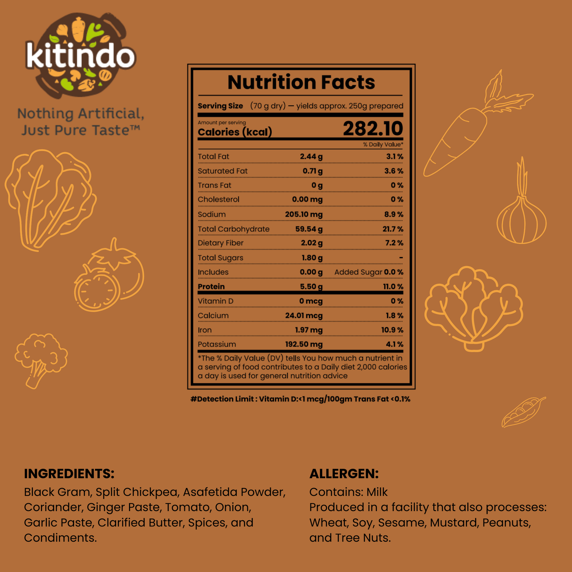 Black lentils are an exceptional source of plant protein, fiber, and complex carbohydrates, keeping blood sugar levels stable while promoting muscle recovery. The high magnesium and phosphorus content strengthens bones and improves nerve function, while ghee enhances the absorption of B vitamins that support mental clarity, mood stability, and cognitive performance.