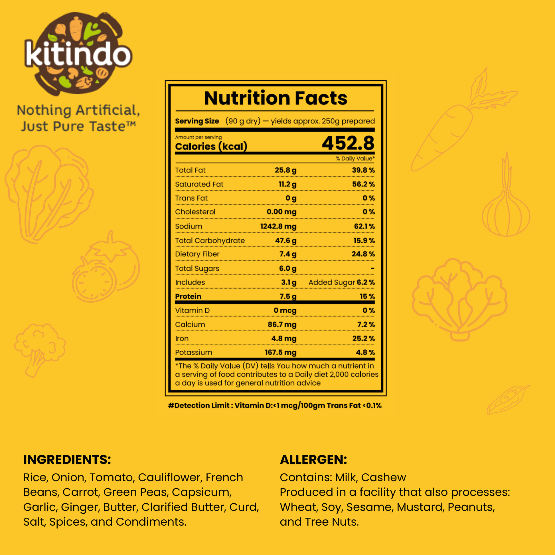 This nutrient-dense biryani contains a blend of slow-cooked vegetables, rich in fiber, vitamins, and minerals, which promote gut health and overall immunity. Saffron and cardamom, traditionally used in Ayurvedic medicine, help boost mood, improve digestion, and enhance circulation. Ghee further aids in the absorption of antioxidants, lubricates the joints, and provides brain-nourishing fats, ensuring a balanced and fulfilling meal.
